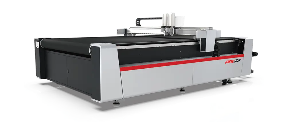 Mesa de corte profissional Firecut 2516AK, equipada com esteira para cortes contínuos, câmera de alta precisão e dois cabeçotes possibilitando o uso de diversas ferramentas de corte e acabamento.