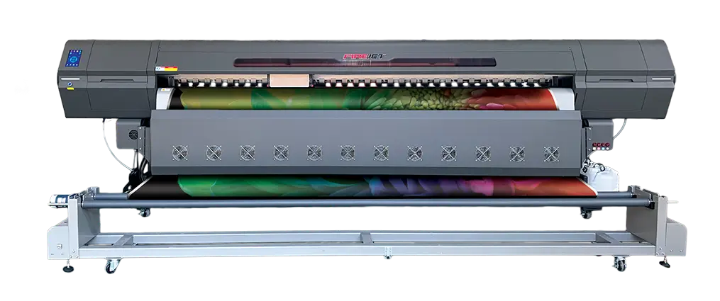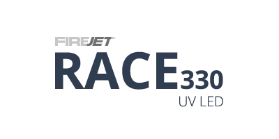 Impressora profissional Firejet RACE 330 Solvente de alta capacidade de produção, com qualidade e design robusto. Disponível nas configurações de cores CMYK. Equipada com 4 a 8 cabeças KM 1024i/13pl.